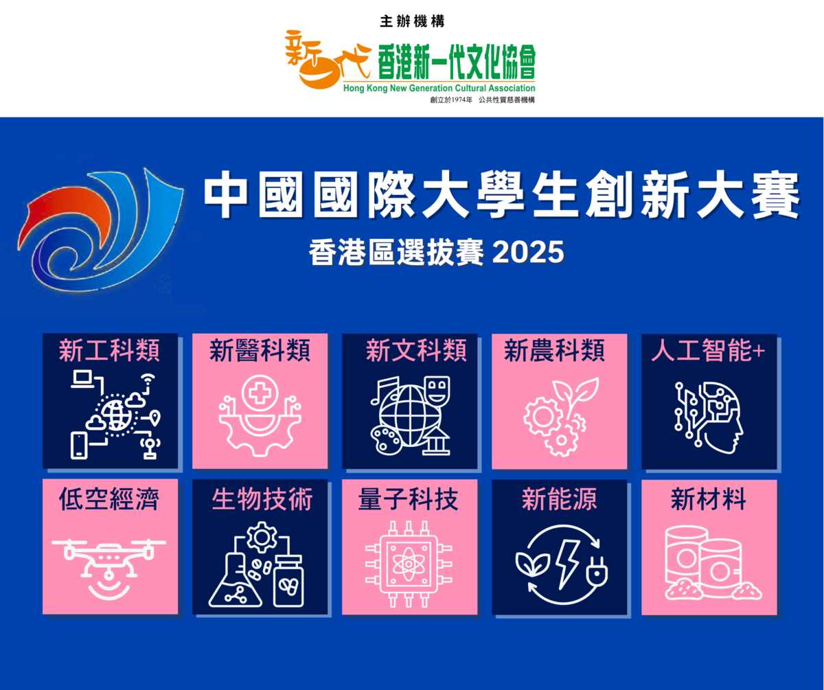 首頁 第三期「新一代粵港澳大灣區青年創業資助計劃」 現正接受報名!第11屆香港大學生創新及創業大賽 已完滿結束啟動:香港大學生創新及創業計劃 012最新消息05.06.2025中國國際大學生創新大賽-香港區選拔賽202509.01.2025中國國際大學生創新大賽2024得獎名單02.07.2024《科技創新創業啟導課程》07.12.2023第9屆中國國際「互聯網+」大學生創新創業大賽得獎名單05.12.2023全國及大灣區青年創新創業大賽 香港區頒獎典禮202307.11.2023第十八屆“挑戰盃”全國大學生課外學術科技作品競賽 – 得獎名單重點推介中國國際大學生創新創業大賽-香港區選拔賽2025 中國國際大學生創新大賽(前稱中國國際「互聯網+」大學生創新及創業大賽)有全球最大、最好的路演平台之美譽。賽事始於2015年,由國務院前總理李克強親自提議舉辦,國務院副總理多次親臨現場,中共中央總書記習近平亦曾兩度以書信問候全體參賽同學(全國唯一獲習近平總書記致賀信的賽事)。 按此了解更多及報名 更多視訊頻道更多 > 第11屆香港大學生創新及創業大賽花絮 2025活動相簿更多 > 中國國際大學生創新大賽(2025)-港澳區域賽創科資訊閱讀更多 > 得獎項目追蹤:麵包啤酒
